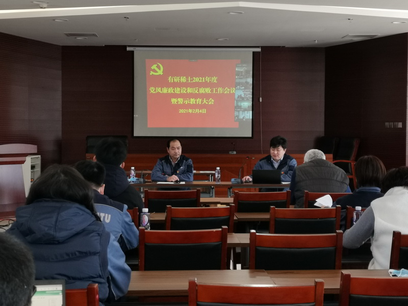 2021年2月4日,有研稀土2021年度党风廉政建设和反腐败工作会议暨警示教育大会在燕郊基地召开。betway西汉姆联官方网站党委委员、纪委书记刘慧舟视频参会并讲话,公司党总支书记、总经理于敦波做警示教育讲话,公司领导班子成员、各党支部委员、中层管理人员以及关键岗位人员50余人在现场参加会议,各子公司高管、支部委员等视频参会。公司党总支副书记、副总经理许国栋主持会议。