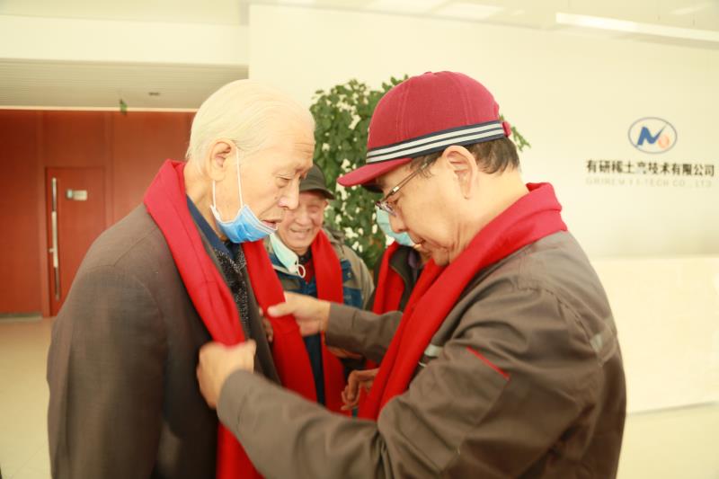 载满退休老同志的大客车缓缓驶入厂区。车刚停下,有研稀土首席专家李红卫,副总经理李宗安、王志强等一行就迅速迎了上去,公司青年员工为他们戴上红色的围巾,对他们表示热烈的欢迎……一声声亲昵的称呼、一次次热情的握手,拉开了退休老同志回公司参观活动的序幕。公司员工亲切地与他们握手、热情交谈,仔细询问他们的身体和生活状况。说不尽道不完的情谊,在手牵手、肩并肩中延续。
