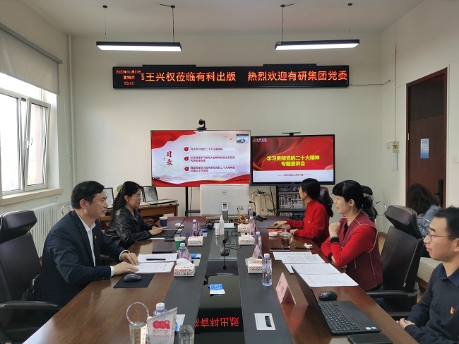 11月17日,有研集团党委副书记王兴权到有科出版宣讲党的二十大精神。有科出版领导班子,全体党员、干部职工参会。会议由有科出版党支部书记、董事长、总经理钱九红主持。